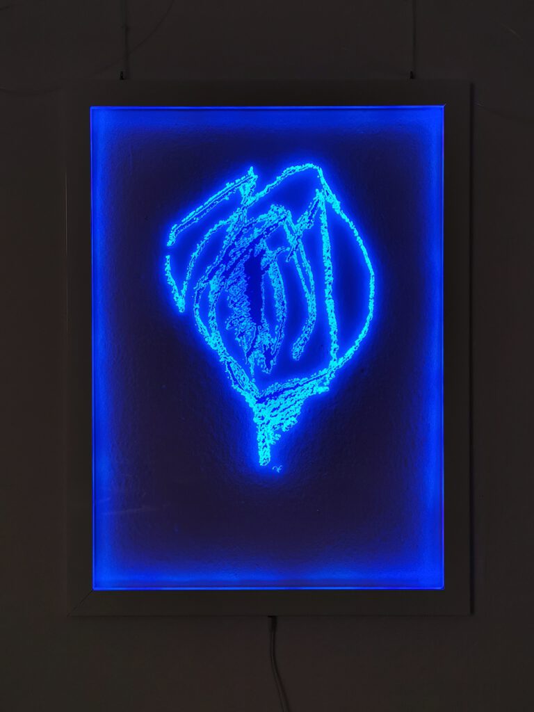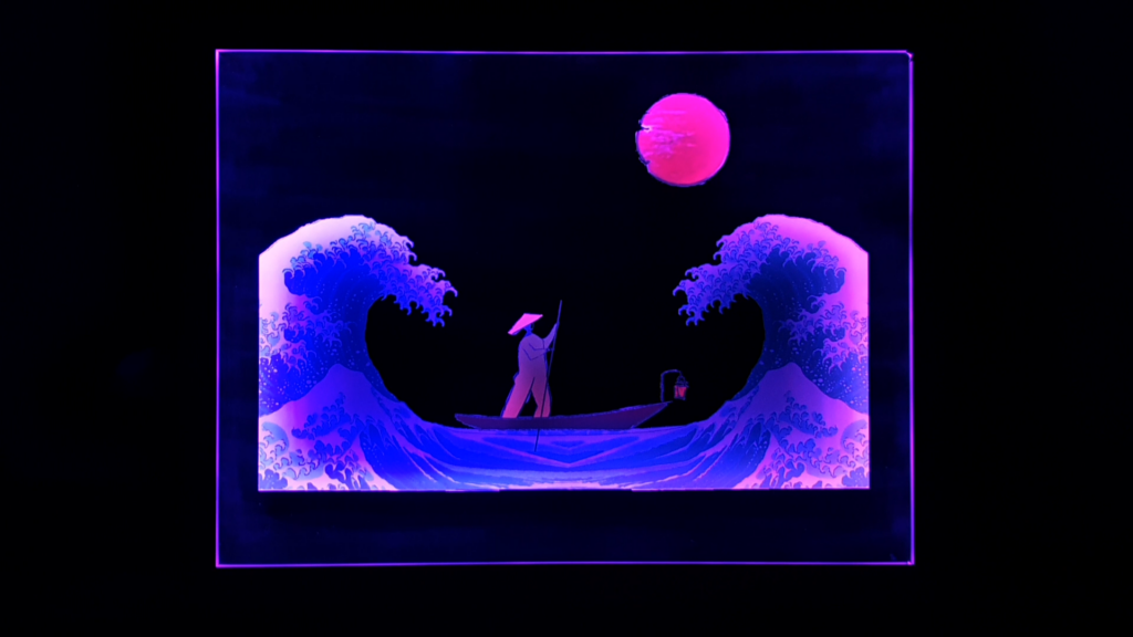 Transparent schwebt das Motiv im Raum. Farbiges Licht trifft auf Farbe im Motiv. Und ein ganz eigenes Spiel beginnt. Reflexion – Absorption, Farben verstärken sich. Farben löschen sich aus. Flächen changieren – Linien treten hervor und weichen zurück. Glas-klar ist das Medium – imposant die Durchlässigkeit.